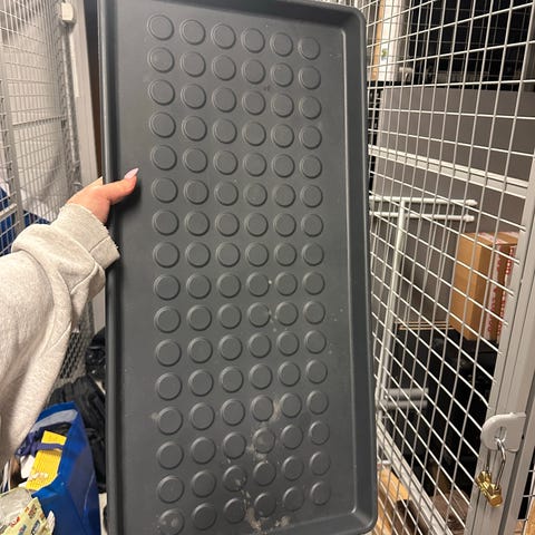 IKEA musta muovinen tarjotin, suorakulmainen muoto, rei'itetty pinta. Soveltuu esimerkiksi tarjoiluun tai pienten esineiden säilytykseen.