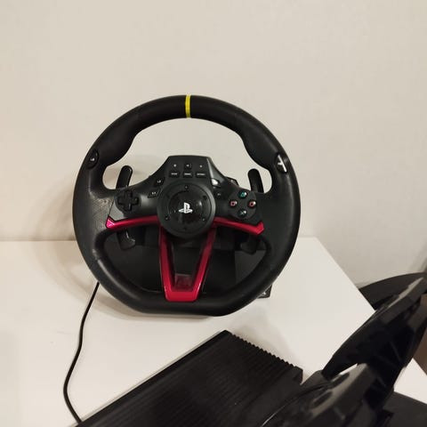 Playstation 4 -yhteensopiva peliohjainratti ja polkimet sisältäen ohjauspyörän, polkimet, kuulokkeet. Kuvassa olevat muut elektroniikat kaupan päälle mukaan.