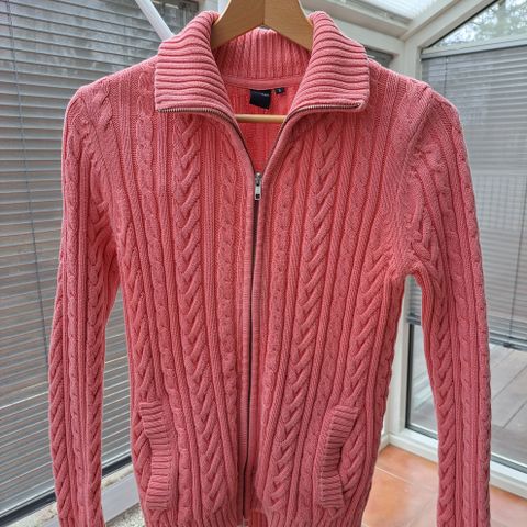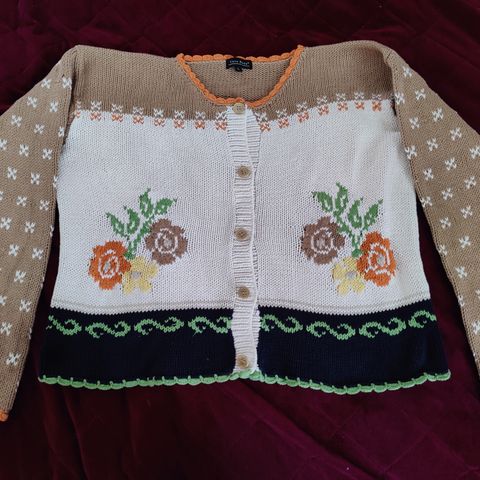 Syksyn sävyinen neuletakki puuvillaa. Pesty hajusteettomalla pesuaineella. Ei eläimiä taloudessa. Toisessa hihansuussa hyvin huomaamaton pieni tumma juova. En ole kokeillut tahranpoistoa.