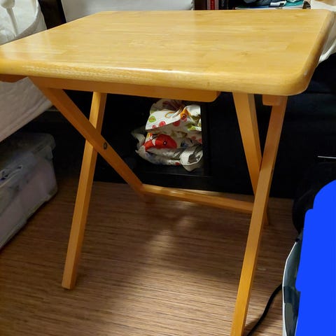 Kokonaan metallinen pöytä, leveys noin 47cm, korkeus 53cm.