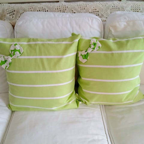 Pirteän aurinkoiset sisustustyynynpäälliset jotka ovat käyttämättömät, mutta ommeltu retrokankaasta josta näkyy että ei ole täysin uutta.