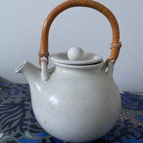 Myydään hyväkuntoinen valkoinen Pentikin teepannu. Tähän mahtuu teetä vieraitakin varten. Viimeisessä kuvassa kuppi tuomassa mittakaavaa.