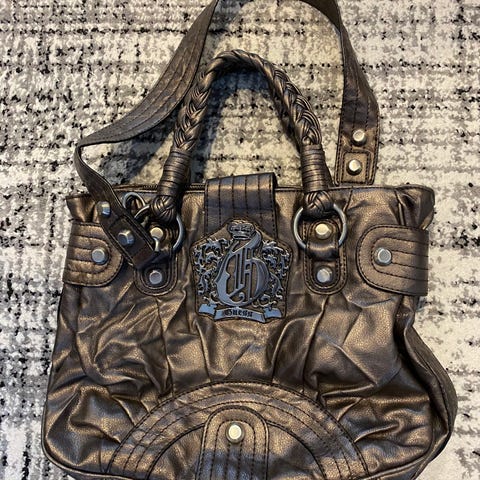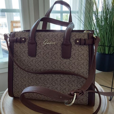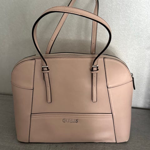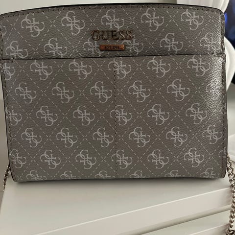 Aito Guess käsilaukku, valmistettu tekonahasta. Laukussa on vetoketjukiinnitys ja sisäpuolella useita taskuja. Laukun pinta on koristeltu Guessin logokuvioinnilla.