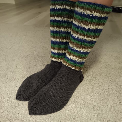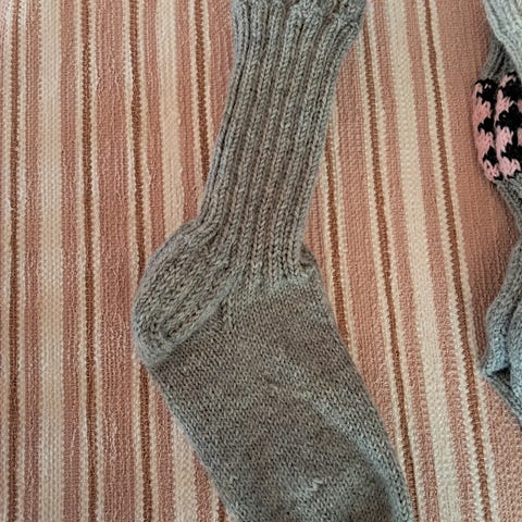 Vaaleanharmaat itse kudotut villasukat 7 veljestä langasta. Koko sopii 38 - 42 välille. Varsi pitkä, ihanan lämpöiset. Ei eläimiä. Kaikki kuvassa näkyvät kolmet sukat myynnissä. Postitus tai nouto.