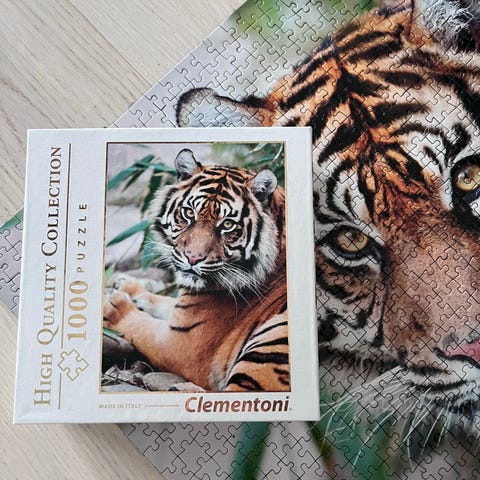 Palapeli, jossa on 1000 palaa. Palapeli sisältää kullanvärisiä yksityiskohtia.