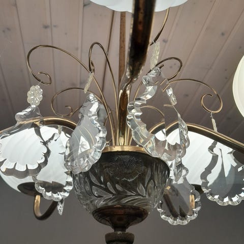 Kaunis kolme valolähteinen kristallikynttelikkö 50luvun kattovalaisin messinkirungolla. Hml. Kuljetus lähialueille Tre-Hki akselilla järjestyy