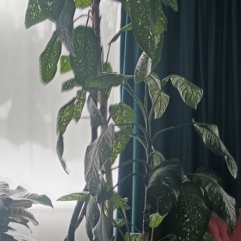 Nuori kirjovehka muoviruukussa. Kork. ruukkuineen n.60cm.