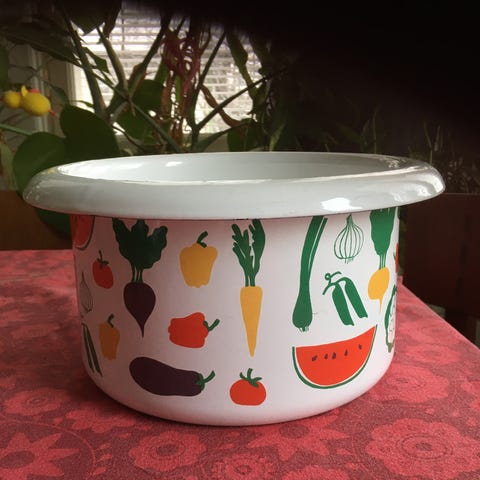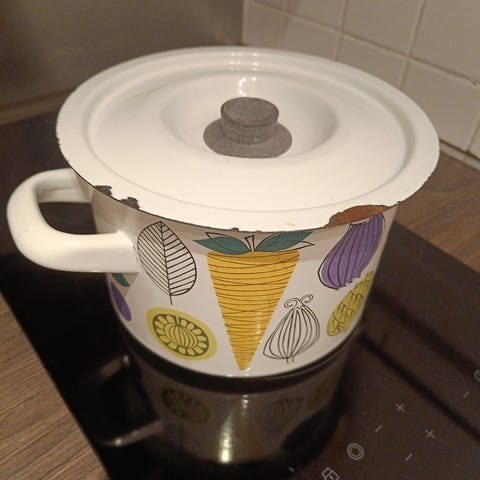 Arabia iki-ihana Vegeta- kattila. Halkaisija 21cm, korkeus 14 cm. Kattilassa on käytön jälkiä sisäpinnalla.
