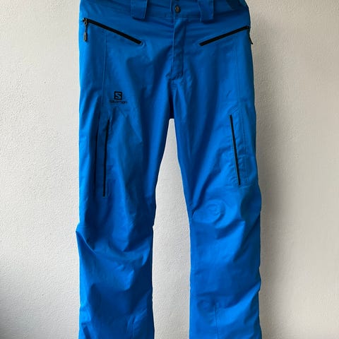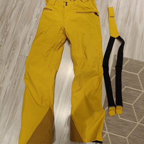 Hyväkuntoiset kevyesti topatut lasketteluhousut. Lahkeissa lumilukot, reiden sisäpuolen kohdalla tuuletusvetskarit. Kaksi vetoketjullista taskua. Henkselit voi myös irrottaa. Huom. Kapea malli!