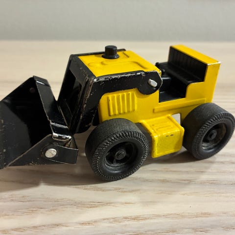 Pieni puinen traktori, jossa muovikauha.