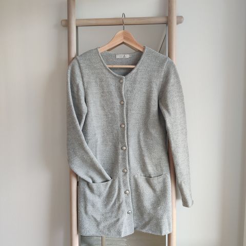 Alpa tummanharmaa villatakki koko M. Pinta hieman pehmentynyt paikoin, mutta Alpan täyshuoltopalvelussa tästä saa varmasti kuin uuden.