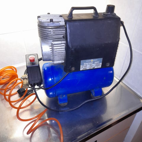Muutamia kertoja käytetty ilmakompressori, ammattilaisellle, Toimii verkkovirralla ja 12v auton akusta. Esitteen mukaan sopii sukelluspullojen ja erinäköisen paineilmasäiliöiden täyttämiseen sopii myös PCP-ilma-aseille. korkeapainekompressorin paino on noin 10kg