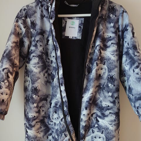 Guppy -merkkinen lasten talvihaalari, koko 116 cm. Kunto hyvä. Haalarissa suden kuvia.
