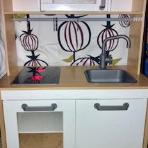 IKEA Duktig lasten leikkikeittiö. Vähän kivemmaksi tuunattu: alkuperäiset vetimet on vaihdettu mustiin lankavetimiin. Läpinäkyviin oviin on teipattu vihreäsävyistä tapettia (nämä ovat tottakai myös irrotettavissa).