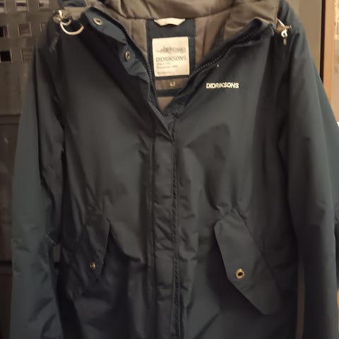 Didriksons lämmin naisten parka. Koko 38. Väri aivan tumma vihreä. Kunto erinomainen.