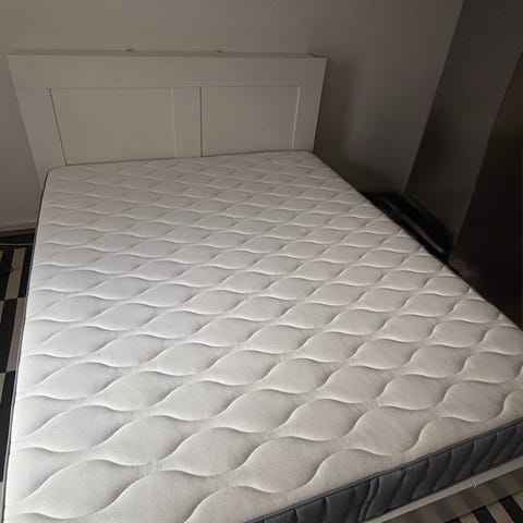 Patjaa on aina käytetty suojalla, joten se on siisti ja puhdas. Kiinteä patja tukee hyvin selkää ja sijauspatja lisää mukavuutta. Sängynpääty on käytännöllinen ja tyylikäs, ja siinä on hyllytilaa sivuilla.