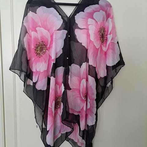 Kevyt, pohjepituinen, pohjaväriltään tumma fuksian värinen kuviollinen intialainen kaftaani.