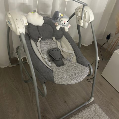 Myydään Emma koliikkikeinu/ vauvan keinu, joka toimii paristoilla. Keinussa on kolme eri nopeusastetta, ajastintoiminto ja keinusta saa halutessaan musiikkia tai linnunlaulua kuulumaan. Keinussa on vyöt ja kankaan saa irrotettua, on helppo pestä. Muutama lelu tulee mukaan, leluja voi vaihtaa ja lelukaaren saa halutessaan myös kokonaan irti. Paristot juuri vaihdettu ja tulee mukana. Ostettu käytettynä ja ei ollut meillä juurikaan käytössä, kangas on juuri pesty. Siistissä kunnossa.