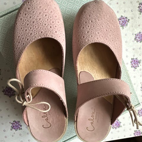 Päällys ja sisäpohja nahkaa. Ulkopohja kumisekoitetta. Melko pientä kokoa ja kapeahko malli. Siistikuntoiset.