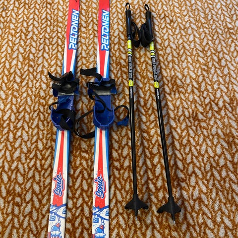 Myydään siistit ja hyväkuntoiset lasten sukset, Peltonen 120 cm NNN-siteillä + sauvat 95 cm.