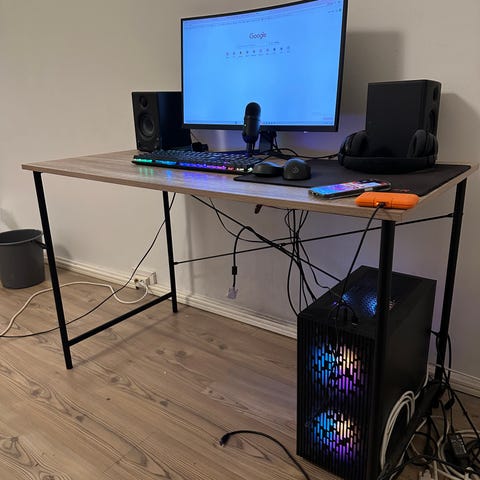 Annetaan kirjoituspöytä. Muuten täysin ehjä ja toimiva, mutta kannessa liimatahroja. Saa ehkä jollain poistettua.