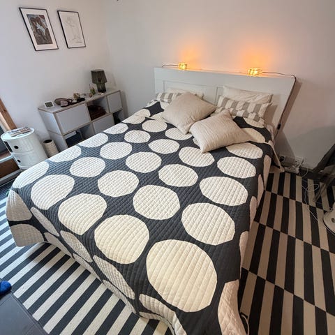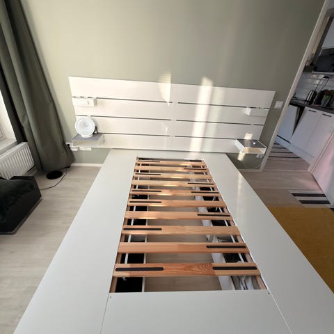 Valkoinen Nordli sängynrunko, jossa käytännölliset säilytyslaatikot. Tukeva ja toimiva runko.