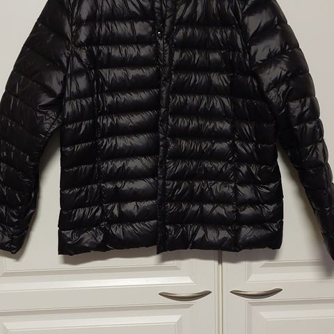 Musta, muutaman kerran päällä käynyt kevytoppis London Frog (SOK) kokoa 46. Menee pieneen tilaan, täytteenä polyesteri, joten ei paukkupakkasten vaate. Väri kiiltävä musta.