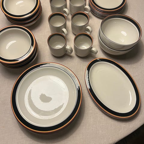 Arabia lautaset, 6 kappaletta. Lautaset ovat valkoisia, ja niissä on musta leveä ja kapeat keltainen ja oranssi ja reunakoristeet. . Materiaali posliinia. Lautasen halkaisija 25 cm. Olleet kaapissa, jonkin verran käytetty. Täysin ehjät. Takana numerointi.