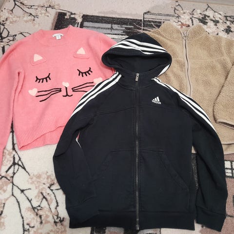 Adidas collegehuppari, 140 (tässä hihansuissa tummentumaa ja joku himmeä tahra voi olla, koska käytetty ulkona)