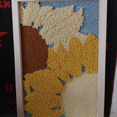 Gobelin, itse ommeltu Puuvilla lankaa käyttäen. Kehykset teetetty, laadukas teko. 21 cmx 27 cm kehyksineen. Mmm