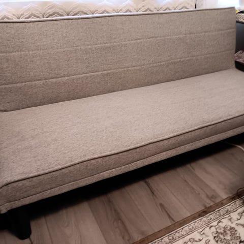 Vaalea sohva josta saa vuoteen. Hyvässä kunnossa, on ehkä, yhden tahran huomasin, siitä kuva. En ole yrittänyt poistaa.