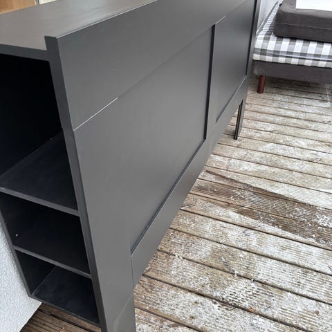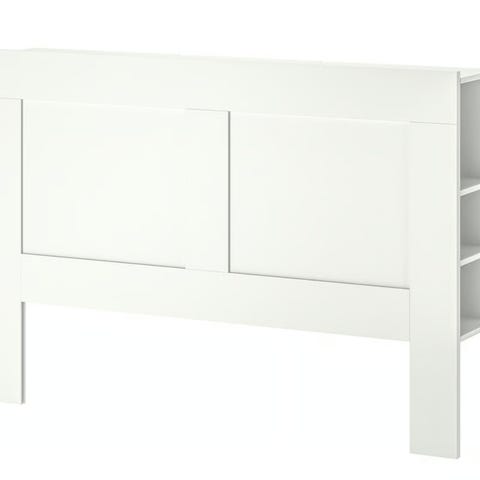 Valkoinen Bremnes sängynpääty, jossa hyllytilaa ja säilytystilaa. Sopii 160 cm leveään sänkyyn. Kätevä esimerkiksi kirjoille, puhelimelle tai valaisimelle.