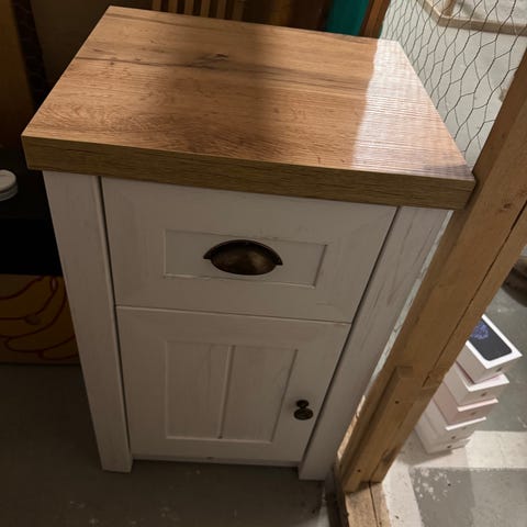 Jyskin valkoinen Oplev-yöpöytä puujaloilla. Erittäin hyvässä kunnossa, ollut satunnaisessa käytössä vierashuoneessa pari vuotta. Ainona mainittavana on pintanaarmu pöytälevyssä. Itse en näe naarmua kauempaa lainkaa eikä se erotu silmiinpistävästi. Katso lisäkuva naarmusta, piirtämäni oranssin viivan yläpuolella. Takana taustalevyssä läpivientireikä pienelle johdolle eli laatikkoon voi laittaa esim. kännykän lataukseen.
