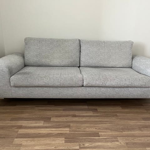 Sohva käytössä ollut, kangas kuitenkin todella siisti. Normaalia kankaan haalistumista toki nähtävissä. Niin kuin kuvista näkyy, ei värieroa edes enemmin huomaa.