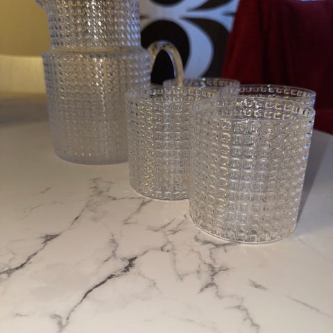 Nuutajärven lasisarjaa alkuperäisessä paketissa. Hyvässä kunnossa ja ehjät. Lautasia isompia yhteensä 6kpl eli pari puuttuu.