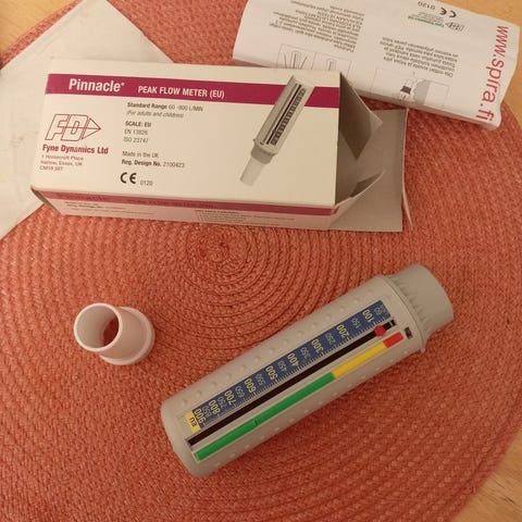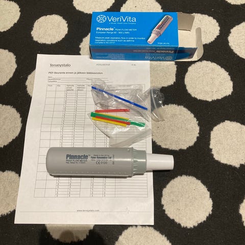 Timik Pinnacle hengitysfysiologinen mittari, joka mittaa hengityksen tilaa. Laite sisältää mittausasteikon ja värikoodatut mittatikut. Käytetään hengitystoiminnan arviointiin ja seurannan apuvälineenä esim astman pef-seurantaan.