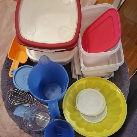 Kuvanmukaiset Tupperwaren keittiövälineet. Ovat olleet käytössä, mutta toimii vielä hyvin.