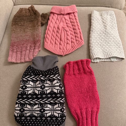 Myydään kuvassa näkyvät pienen koiran /pennun vaatteet. Olleet käytössä pienellä lyhytkarvaisella chihuahualla. Ehjät ja pesty.
