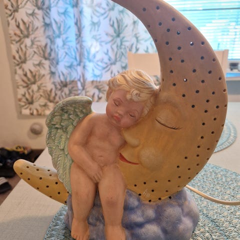 Pöytälamppu, jossa vaalenpunainen keraaminen jalka. Lampun merkki ei ole tiedossa, varjostin on ikeasta. Korkeus varjostimen kanssa 61 cm. Nouto Heikinlaaksosta tai muusta sovitusta paikasta AB vyöhykkeellä.