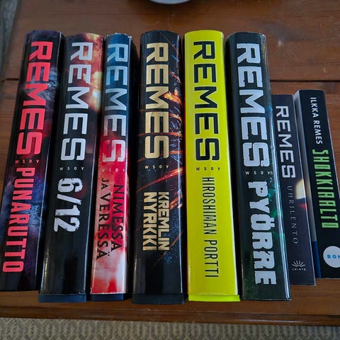 Kuvissa näkyvät kirjat, jotka Ilkka Remes nuorille kirjoittanut, minimaaliset käytön jäljet.