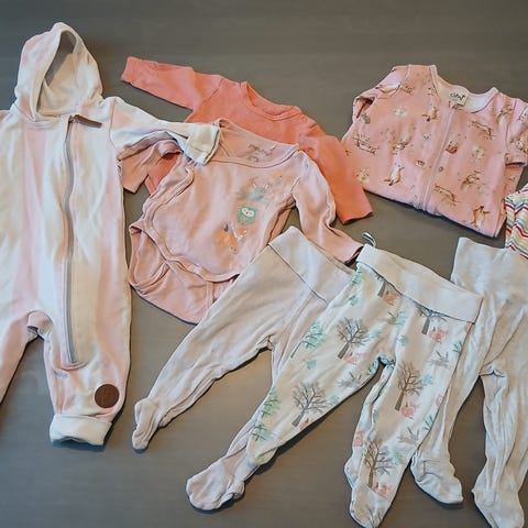 Unihaalari jalkaterillä, kaksi bodya, sukkahousut, kahdet housut ja collegepaita. Kaikki kokoa 62.