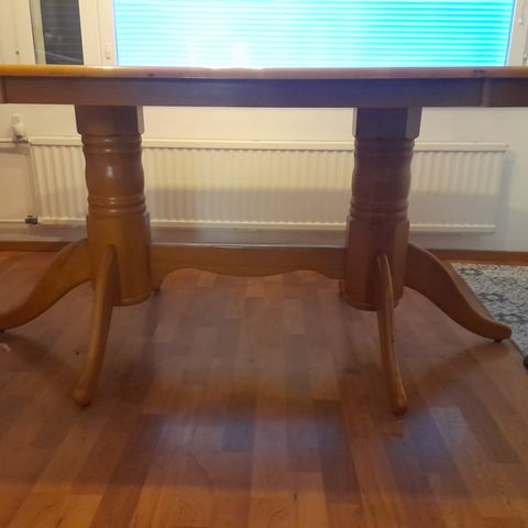 Pöydässä tussinjälkiä, joita en ole saanut pois. Pöytä kuitenkin täyspuuta. Sen voi hioa ja lakata uudelleen, jolloin pöydästä saa aivan uudenveroisen.