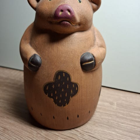 Posliininen säästöpossu, muotoiltu sika-hahmoksi, jossa siniset haalarit ja lippalakki. Käytettävissä rahojen säilytykseen tai koriste-esineenä.