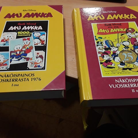 Muovikassillinen Aku Ankkoja ja pari Simpson kirjaa.