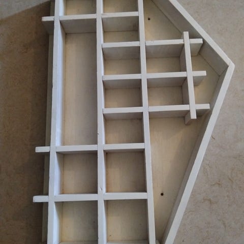 4 tasoinen seinään nojaava hyllykkö esim koriste-esineille.