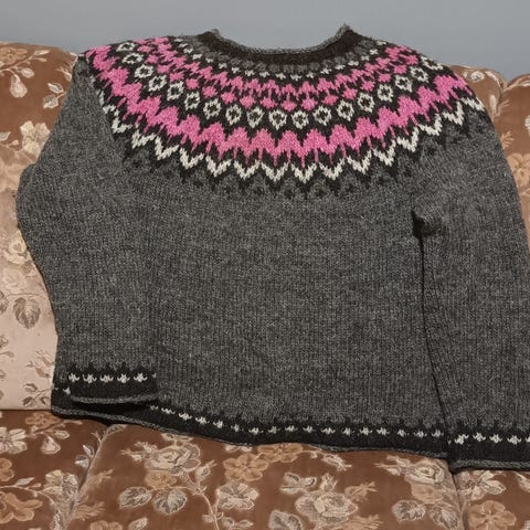 Uusi, violetinsininen villapaita 100% islanninvillalangasta (Lettlopi). Mitat: rinnanympärys 108 cm, helman leveys 112 cm, olka-helma 68 cm ja hiha kainalo- ranne 51 cm. Helmassa sivuilla pienet halkiot.
