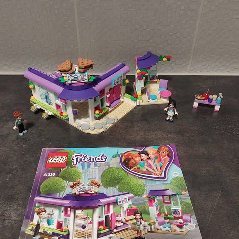 Hyväkuntoinen Lego Friends kuppikakkukahvila. Sisältää melkein kaikki palat ja kaksi henkilöä. Muutama pala puuttuu, mutta ei vaikuta rakentamiseen. Tarrat luonnollisesti jo laitettu.