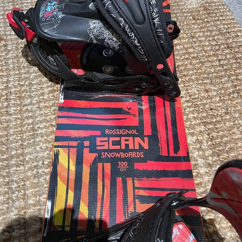 Lasten 125cm pitkä rossignolin lumilauta ja siteet. Kärjessä vähän jälkeä ja liimailtu tarroja muuten ihan ok lauta aloitukseen.