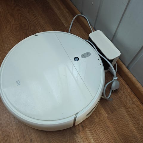 Xiaomi Mi Robot Vacuum-Mop P robotti-imuri, valkoinen väri. Sisältää lisävarusteita kuten sivuharjan, suodattimen ja latausaseman.