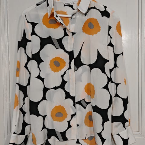 Marimekon silkkipaitis, koko 38. Siistissä kunnossa beigesävyinen paita.